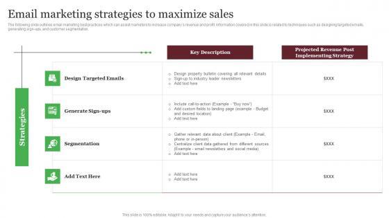The following slide outlines email marketing best practices which can assist marketers to increase companys revenue and profit. Information covered in this slide is related to techniques such as designing targeted emails, generating sign-ups, and customer segmentation. Whether you have daily or monthly meetings, a brilliant presentation is necessary. Email Marketing Strategies To Maximize Sales Out Of The Box Real Pictures Pdf can be your best option for delivering a presentation. Represent everything in detail using Email Marketing Strategies To Maximize Sales Out Of The Box Real Pictures Pdf and make yourself stand out in meetings. The template is versatile and follows a structure that will cater to your requirements. All the templates prepared by Slidegeeks are easy to download and edit. Our research experts have taken care of the corporate themes as well. So, give it a try and see the results. The following slide outlines email marketing best practices which can assist marketers to increase companys revenue and profit. Information covered in this slide is related to techniques such as designing targeted emails, generating sign-ups, and customer segmentation.