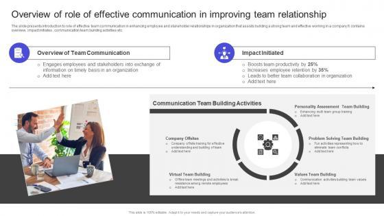 The slide presents introduction to role of effective team communication in enhancing employee and stakeholder relationships in organization that assists building a strong team and effective working in a company It contains overview, impact initiates , communication team building activities etc. Slidegeeks has constructed Strategies To Build Meaningful Overview Of Role Of Effective Communication In Improving Summary PDF after conducting extensive research and examination. These presentation templates are constantly being generated and modified based on user preferences and critiques from editors. Here, you will find the most attractive templates for a range of purposes while taking into account ratings and remarks from users regarding the content. This is an excellent jumping-off point to explore our content and will give new users an insight into our top-notch PowerPoint Templates. The slide presents introduction to role of effective team communication in enhancing employee and stakeholder relationships in organization that assists building a strong team and effective working in a company It contains overview, impact initiates , communication team building activities etc.