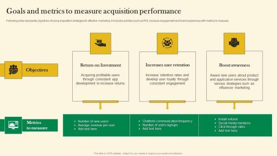 Following slide represents objectives of using acquisition strategies for effective marketing. It includes pointers such as ROI, increase engagement and brand awareness with metrics to measure. Present like a pro with Goals And Metrics To Measure Acquisition Performance Online Customer Acquisition Microsoft Pdf Create beautiful presentations together with your team, using our easy-to-use presentation slides. Share your ideas in real-time and make changes on the fly by downloading our templates. So whether you are in the office, on the go, or in a remote location, you can stay in sync with your team and present your ideas with confidence. With Slidegeeks presentation got a whole lot easier. Grab these presentations today. Following slide represents objectives of using acquisition strategies for effective marketing. It includes pointers such as ROI, increase engagement and brand awareness with metrics to measure.