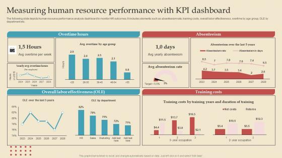 The following slide depicts human resource performance analysis dashboard to monitor HR outcomes. It includes elements such as absenteeism rate, training costs, overall labor effectiveness, overtime by age group, OLE by department etc. Do you have to make sure that everyone on your team knows about any specific topic I yes, then you should give Measuring Human Resource Describing Business Performance Administration Goals Rules Pdf a try. Our experts have put a lot of knowledge and effort into creating this impeccable Measuring Human Resource Describing Business Performance Administration Goals Rules Pdf. You can use this template for your upcoming presentations, as the slides are perfect to represent even the tiniest detail. You can download these templates from the Slidegeeks website and these are easy to edit. So grab these today The following slide depicts human resource performance analysis dashboard to monitor HR outcomes. It includes elements such as absenteeism rate, training costs, overall labor effectiveness, overtime by age group, OLE by department etc.