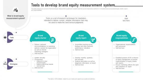 This slide presents an overview of the brand equity measurement system and valuable tools that can be employed to optimize it. It includes tools such as brand equity charter, report, and responsibilities. If you are looking for a format to display your unique thoughts, then the professionally designed Brand Equity Management To Raise Tools To Develop Brand Equity Measurement System is the one for you. You can use it as a Google Slides template or a PowerPoint template. Incorporate impressive visuals, symbols, images, and other charts. Modify or reorganize the text boxes as you desire. Experiment with shade schemes and font pairings. Alter, share or cooperate with other people on your work. Download Brand Equity Management To Raise Tools To Develop Brand Equity Measurement System and find out how to give a successful presentation. Present a perfect display to your team and make your presentation unforgettable. This slide presents an overview of the brand equity measurement system and valuable tools that can be employed to optimize it. It includes tools such as brand equity charter, report, and responsibilities.