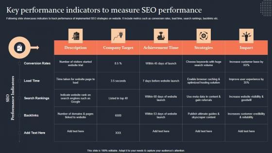 Following slide showcases indicators to track performance of implemented SEO strategies on website. It include metrics such as conversion rates, load time, search rankings, backlinks etc. This Key Performance Indicators To Measure Seo Performance Step By Step Guide Download PDF is perfect for any presentation, be it in front of clients or colleagues. It is a versatile and stylish solution for organizing your meetings. The Key Performance Indicators To Measure Seo Performance Step By Step Guide Download PDF features a modern design for your presentation meetings. The adjustable and customizable slides provide unlimited possibilities for acing up your presentation. Slidegeeks has done all the homework before launching the product for you. So, do not wait, grab the presentation templates today Following slide showcases indicators to track performance of implemented SEO strategies on website. It include metrics such as conversion rates, load time, search rankings, backlinks etc.