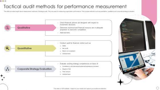 This slide provides insight about measurement methods of strategic audit. They are used for measuring organization performance. This includes methods such as quantitative, qualitative and corporate strategy evaluation. Pitch your topic with ease and precision using this Tactical Audit Methods For Performance Measurement Designs Pdf. This layout presents information on Quantitative, Qualitative, Corporate Strategy Evaluation, Performance Measurement. It is also available for immediate download and adjustment. So, changes can be made in the color, design, graphics or any other component to create a unique layout. This slide provides insight about measurement methods of strategic audit. They are used for measuring organization performance. This includes methods such as quantitative, qualitative and corporate strategy evaluation.