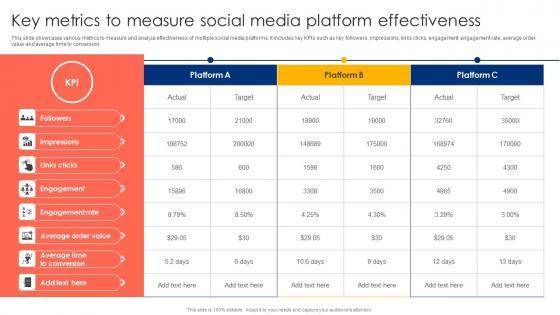 This slide showcases various metrics to measure and analyze effectiveness of multiple social media platforms. It includes key KPIs such as key followers, impressions, links clicks, engagement, engagement rate, average order value and average time to conversion. Showcasing this set of slides titled Key Metrics To Measure Social Media Platform Effectiveness Ppt Layouts Background Designs Pdf. The topics addressed in these templates are Engagement, Engagement Rate, Average Order. All the content presented in this PPT design is completely editable. Download it and make adjustments in color, background, font etc. as per your unique business setting. This slide showcases various metrics to measure and analyze effectiveness of multiple social media platforms. It includes key KPIs such as key followers, impressions, links clicks, engagement, engagement rate, average order value and average time to conversion.