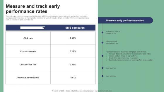 This slide represents the measurement and tracking of SMS marketing performance in order to analyze best performing and least performing areas for making better decisions for future. It includes details related to SMS marketing performance such as conversion rates, click rates etc. Slidegeeks is here to make your presentations a breeze with Measure And Track Early Performance Rates Ppt PowerPoint Presentation File Infographic Template PDF With our easy to use and customizable templates, you can focus on delivering your ideas rather than worrying about formatting. With a variety of designs to choose from, you are sure to find one that suits your needs. And with animations and unique photos, illustrations, and fonts, you can make your presentation pop. So whether you are giving a sales pitch or presenting to the board, make sure to check out Slidegeeks first.
