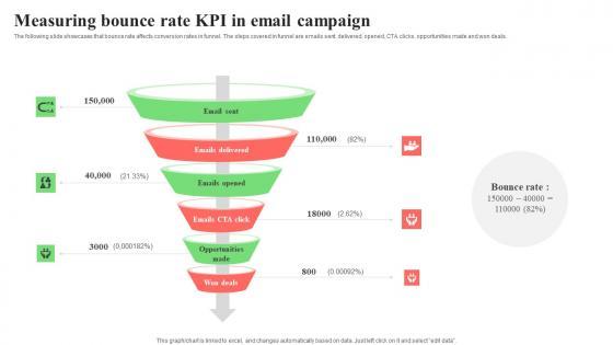 The following slide showcases that bounce rate affects conversion rates in funnel. The steps covered in funnel are emails sent, delivered, opened, CTA clicks, opportunities made and won deals. Pitch your topic with ease and precision using this Measuring Bounce Rate KPI In Email Campaign Designs Pdf. This layout presents information on Delivered, Opened, CTA Clicks, Opportunities. It is also available for immediate download and adjustment. So, changes can be made in the color, design, graphics or any other component to create a unique layout. The following slide showcases that bounce rate affects conversion rates in funnel. The steps covered in funnel are emails sent, delivered, opened, CTA clicks, opportunities made and won deals.