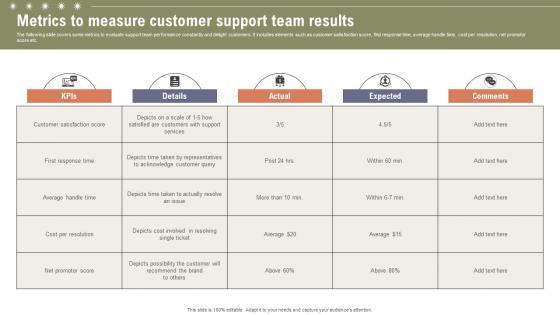 The following slide covers some metrics to evaluate support team performance constantly and delight customers. It includes elements such as customer satisfaction score, first response time, average handle time, cost per resolution, net promotor score etc. This Metrics To Measure Customer Support Boosting Customer Retention Rate With Live Chat is perfect for any presentation, be it in front of clients or colleagues. It is a versatile and stylish solution for organizing your meetings. The Metrics To Measure Customer Support Boosting Customer Retention Rate With Live Chat features a modern design for your presentation meetings. The adjustable and customizable slides provide unlimited possibilities for acing up your presentation. Slidegeeks has done all the homework before launching the product for you. So, do not wait, grab the presentation templates today The following slide covers some metrics to evaluate support team performance constantly and delight customers. It includes elements such as customer satisfaction score, first response time, average handle time, cost per resolution, net promotor score etc.