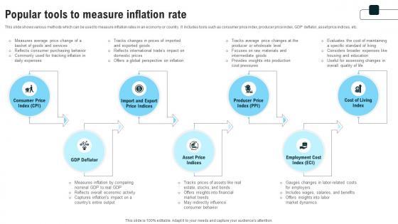 This slide shows various methods which can be used to measure inflation rates in an economy or country. It includes tools such as consumer price index, producer price index, GDP deflator, asset price indices, etc. Create an editable Popular Tools To Measure Inflation Rate Strategies For Inflation A Tactical Guide Fin SS V that communicates your idea and engages your audience. Whether you are presenting a business or an educational presentation, pre-designed presentation templates help save time. Popular Tools To Measure Inflation Rate Strategies For Inflation A Tactical Guide Fin SS V is highly customizable and very easy to edit, covering many different styles from creative to business presentations. Slidegeeks has creative team members who have crafted amazing templates. So, go and get them without any delay. This slide shows various methods which can be used to measure inflation rates in an economy or country. It includes tools such as consumer price index, producer price index, GDP deflator, asset price indices, etc.