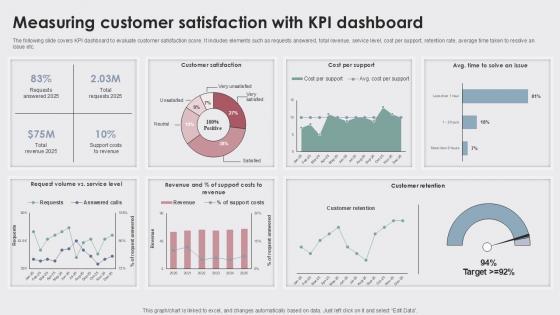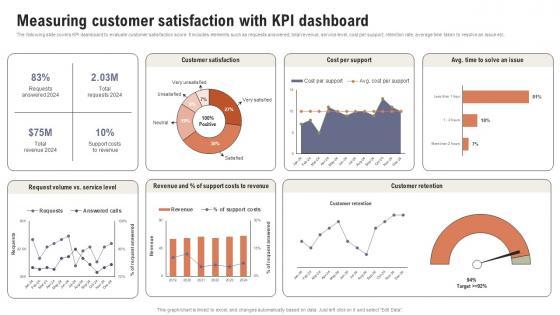 The following slide covers KPI dashboard to evaluate customer satisfaction score. It includes elements such as requests answered, total revenue, service level, cost per support, retention rate, average time taken to resolve an issue etc. This modern and well-arranged Measuring Customer Satisfaction Improving Customer Retention PPT Template provides lots of creative possibilities. It is very simple to customize and edit with the Powerpoint Software. Just drag and drop your pictures into the shapes. All facets of this template can be edited with Powerpoint, no extra software is necessary. Add your own material, put your images in the places assigned for them, adjust the colors, and then you can show your slides to the world, with an animated slide included. The following slide covers KPI dashboard to evaluate customer satisfaction score. It includes elements such as requests answered, total revenue, service level, cost per support, retention rate, average time taken to resolve an issue etc.