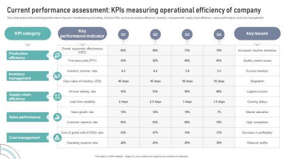This slide analysis the declining performance of goods manufacturing and selling . It tracks KPIs such as production efficiency, inventory management, supply chain efficiency, sales performance, and cost management.Are you in need of a template that can accommodate all of your creative concepts This one is crafted professionally and can be altered to fit any style. Use it with Google Slides or PowerPoint. Include striking photographs, symbols, depictions, and other visuals. Fill, move around, or remove text boxes as desired. Test out color palettes and font mixtures. Edit and save your work, or work with colleagues. Download Current Performance Assessment KPIs Measuring Operational Efficiency Of Company DT SS V and observe how to make your presentation outstanding. Give an impeccable presentation to your group and make your presentation unforgettable. This slide analysis the declining performance of goods manufacturing and selling . It tracks KPIs such as production efficiency, inventory management, supply chain efficiency, sales performance, and cost management.