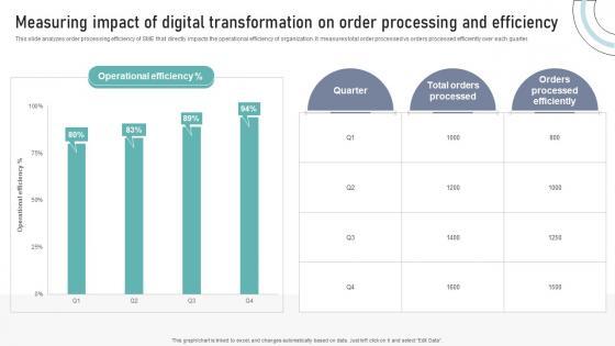 This slide analyzes order processing efficiency of SME that directly impacts the operational efficiency of organization. It measures total order processed vs orders processed efficiently over each quarter.Do you have an important presentation coming up Are you looking for something that will make your presentation stand out from the rest Look no further than Measuring Impact Of Digital Transformation On Order Processing And Efficiency DT SS V. With our professional designs, you can trust that your presentation will pop and make delivering it a smooth process. And with Slidegeeks, you can trust that your presentation will be unique and memorable. So why wait Grab Measuring Impact Of Digital Transformation On Order Processing And Efficiency DT SS V today and make your presentation stand out from the rest This slide analyzes order processing efficiency of SME that directly impacts the operational efficiency of organization. It measures total order processed vs orders processed efficiently over each quarter.