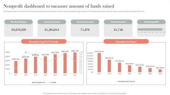 This slide provides an overview of the fundraising dashboard used to determine the money collected through donations. The dashboard includes net funds raised, online donations, fundraising ROI, etc.Boost your pitch with our creative Non profit Dashboard To Measure Amount Of Funds Efficient Nonprofit Marketing Background Pdf. Deliver an awe-inspiring pitch that will mesmerize everyone. Using these presentation templates you will surely catch everyones attention. You can browse the ppts collection on our website. We have researchers who are experts at creating the right content for the templates. So you do not have to invest time in any additional work. Just grab the template now and use them. This slide provides an overview of the fundraising dashboard used to determine the money collected through donations. The dashboard includes net funds raised, online donations, fundraising ROI, etc.