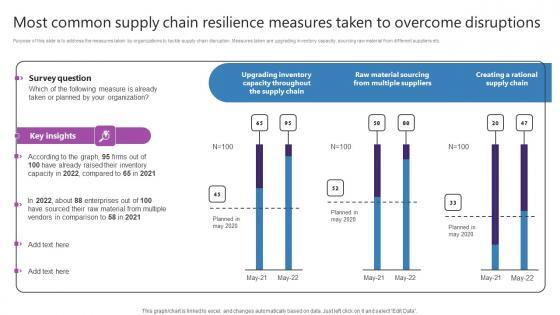 Purpose of this slide is to address the measures taken by organizations to tackle supply chain disruption. Measures taken are upgrading inventory capacity, sourcing raw material from different suppliers etc.Create an editable Most Common Supply Chain Resilience Measures Taken To Overcome Disruptions Elements PDF that communicates your idea and engages your audience. Whether you Are presenting a business or an educational presentation, pre-designed presentation templates help save time. Most Common Supply Chain Resilience Measures Taken To Overcome Disruptions Elements PDF is highly customizable and very easy to edit, covering many different styles from creative to business presentations. Slidegeeks has creative team members who have crafted amazing templates. So, go and get them without any delay.