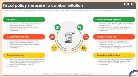 This slide shows various methods and techniques which are used under fiscal policy to control and manage inflation. These methods include taxation, government spending, budget balancing, public debt management, etc. If your project calls for a presentation, then Slidegeeks is your go-to partner because we have professionally designed, easy-to-edit templates that are perfect for any presentation. After downloading, you can easily edit Fiscal Policy Measure To Combat Inflation Comprehensive Guide On Inflation Control CM SS V and make the changes accordingly. You can rearrange slides or fill them with different images. Check out all the handy templates This slide shows various methods and techniques which are used under fiscal policy to control and manage inflation. These methods include taxation, government spending, budget balancing, public debt management, etc.