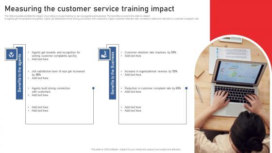 The following slide exhibits the impact of providing in-house training on service agents and business. The benefits covered in the slide is related to agents get rewards and recognition, higher job satisfaction level, strong connection with customers, higher customer retention rate, increase in sales and reduction in customer complaint rate. Welcome to our selection of the Red Ocean Technique Overcoming The Extreme Competition Measuring The Customer Service Training Impact Elements PDF. These are designed to help you showcase your creativity and bring your sphere to life. Planning and Innovation are essential for any business that is just starting out. This collection contains the designs that you need for your everyday presentations. All of our PowerPoints are 100 percent editable, so you can customize them to suit your needs. This multi-purpose template can be used in various situations. Grab these presentation templates today.