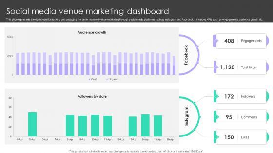 This slide represents the dashboard for tracking and analyzing the performance of venue marketing through social media platforms such as Instagram and Facebook. It includes KPIs such as engagements, audience growth etc. Explore a selection of the finest Online Venue Advertising Plan Social Media Venue Marketing Dashboard Strategy SS V here. With a plethora of professionally designed and pre-made slide templates, you can quickly and easily find the right one for your upcoming presentation. You can use our Online Venue Advertising Plan Social Media Venue Marketing Dashboard Strategy SS V to effectively convey your message to a wider audience. Slidegeeks has done a lot of research before preparing these presentation templates. The content can be personalized and the slides are highly editable. Grab templates today from Slidegeeks. This slide represents the dashboard for tracking and analyzing the performance of venue marketing through social media platforms such as Instagram and Facebook. It includes KPIs such as engagements, audience growth etc.