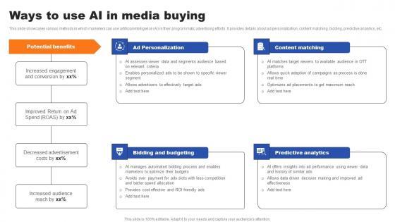 This slide showcases various methods in which marketers can use artificial intelligence AI in their programmatic advertising efforts. It provides details about ad personalization, content matching, bidding, predictive analytics, etc. Do you have to make sure that everyone on your team knows about any specific topic I yes, then you should give Ways To Use AI In Media Buying Professional PDF a try. Our experts have put a lot of knowledge and effort into creating this impeccable Ways To Use AI In Media Buying Professional PDF. You can use this template for your upcoming presentations, as the slides are perfect to represent even the tiniest detail. You can download these templates from the Slidegeeks website and these are easy to edit. So grab these today