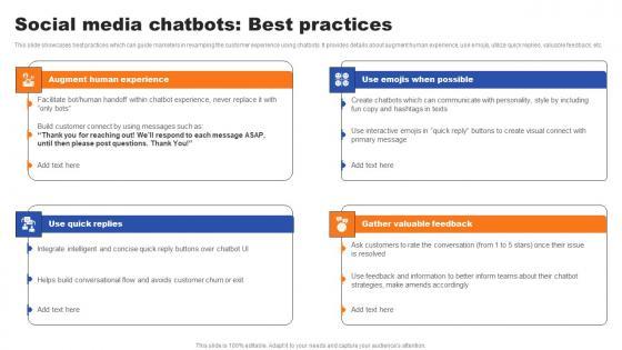 This slide showcases best practices which can guide marketers in revamping the customer experience using chatbots. It provides details about augment human experience, use emojis, utilize quick replies, valuable feedback, etc. Whether you have daily or monthly meetings, a brilliant presentation is necessary. Social Media Chatbots Best Practices Ppt File Influencers PDF can be your best option for delivering a presentation. Represent everything in detail using Social Media Chatbots Best Practices Ppt File Influencers PDF and make yourself stand out in meetings. The template is versatile and follows a structure that will cater to your requirements. All the templates prepared by Slidegeeks are easy to download and edit. Our research experts have taken care of the corporate themes as well. So, give it a try and see the results.