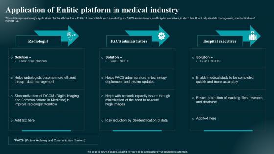 This slide represents major applications of AI healthcare tool Enlitic. It covers fields such as radiologists, PACS administrators, and hospital executives, in which this AI tool helps in data management, standardization of DICOM, etc. Present like a pro with Application Of Enlitic Platform In Medical Industry Applications And Impact Themes Pdf Create beautiful presentations together with your team, using our easy-to-use presentation slides. Share your ideas in real-time and make changes on the fly by downloading our templates. So whether you are in the office, on the go, or in a remote location, you can stay in sync with your team and present your ideas with confidence. With Slidegeeks presentation got a whole lot easier. Grab these presentations today. This slide represents major applications of AI healthcare tool Enlitic. It covers fields such as radiologists, PACS administrators, and hospital executives, in which this AI tool helps in data management, standardization of DICOM, etc.