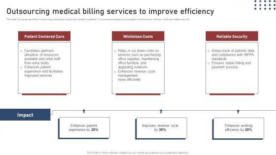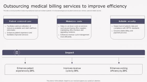 This slide covers key benefits of outsourcing medical services to serve better to patients. It involves advantages such as patient centered care, minimize costs and reliable security. The Incorporating HIS To Enhance Healthcare Services Outsourcing Medical Billing Services To Improve Efficiency Ideas PDF is a compilation of the most recent design trends as a series of slides. It is suitable for any subject or industry presentation, containing attractive visuals and photo spots for businesses to clearly express their messages. This template contains a variety of slides for the user to input data, such as structures to contrast two elements, bullet points, and slides for written information. Slidegeeks is prepared to create an impression.