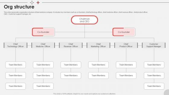 This slide represents organization structure of telemedicine company. It includes key members such as co-founders, chief technology officer, chief medicine officer, chief revenue officer, chief product officer, CMO, Customer support manager, etc. Crafting an eye-catching presentation has never been more straightforward. Let your presentation shine with this tasteful yet straightforward Org Structure Virtual Medical Consultancy Investor Funding Elevator Pitch Deck template. It offers a minimalistic and classy look that is great for making a statement. The colors have been employed intelligently to add a bit of playfulness while still remaining professional. Construct the ideal Org Structure Virtual Medical Consultancy Investor Funding Elevator Pitch Deck that effortlessly grabs the attention of your audience Begin now and be certain to wow your customers This slide represents organization structure of telemedicine company. It includes key members such as co-founders, chief technology officer, chief medicine officer, chief revenue officer, chief product officer, CMO, Customer support manager, etc.