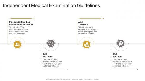Presenting our innovatively designed set of slides titled Independent Medical Examination Guidelines In Powerpoint And Google Slides Cpb. This completely editable PowerPoint graphic exhibits Independent Medical Examination Guidelines that will help you convey the message impactfully. It can be accessed with Google Slides and is available in both standard screen and widescreen aspect ratios. Apart from this, you can download this well-structured PowerPoint template design in different formats like PDF, JPG, and PNG. So, click the download button now to gain full access to this PPT design. Our Independent Medical Examination Guidelines In Powerpoint And Google Slides Cpb are topically designed to provide an attractive backdrop to any subject. Use them to look like a presentation pro.