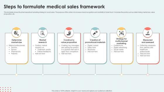 This template shows the pharmaceutical marketing strategy to boost sales. The purpose of this slide is to increase brand recognition and credibility to foster trust. It includes the points such as determining market size, value proposition, etc.Showcasing this set of slides titled Steps To Formulate Medical Sales Framework Introduction Pdf The topics addressed in these templates are Determine Market, Market Research, Value Proposition All the content presented in this PPT design is completely editable. Download it and make adjustments in color, background, font etc. as per your unique business setting. This template shows the pharmaceutical marketing strategy to boost sales. The purpose of this slide is to increase brand recognition and credibility to foster trust. It includes the points such as determining market size, value proposition, etc.
