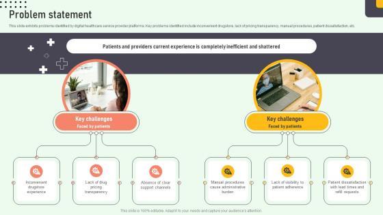 This slide covers problem related to healthcare services and how our company helps to solve them. It involves key problems such as consumer demand to integrate technology and effective navigation of wasteful system. Do you know about Slidesgeeks Problem Statement Medical Benefits Navigation Platform Pitch Deck Ppt Presentation These are perfect for delivering any kind od presentation. Using it, create PowerPoint presentations that communicate your ideas and engage audiences. Save time and effort by using our pre-designed presentation templates that are perfect for a wide range of topic. Our vast selection of designs covers a range of styles, from creative to business, and are all highly customizable and easy to edit. Download as a PowerPoint template or use them as Google Slides themes. This slide covers problem related to healthcare services and how our company helps to solve them. It involves key problems such as consumer demand to integrate technology and effective navigation of wasteful system.