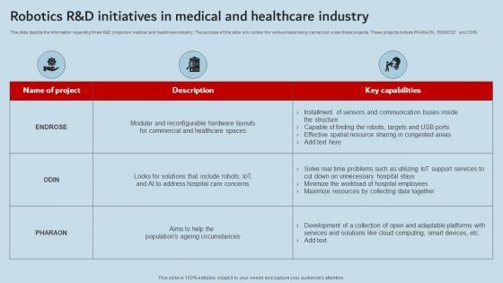 This slide depicts the information regarding three R and D projects in medical and healthcare industry. The purpose of this slide is to outline the various tasks being carried out under these projects. These projects include PHARAON, ENDROSE and ODIN. From laying roadmaps to briefing everything in detail, our templates are perfect for you. You can set the stage with your presentation slides. All you have to do is download these easy-to-edit and customizable templates. Robotics R And D Initiatives In Medical And Healthcare Industry Formats PDF will help you deliver an outstanding performance that everyone would remember and praise you for. Do download this presentation today.