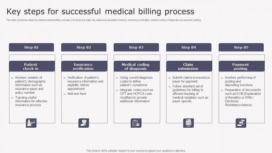 This slide covers key steps for effective medical billing process. It involves five major key steps such as patient check in, insurance verification, medical coding of diagnosis and payment posting. This Key Steps Successful Medical Transforming Medicare Services Using Health Icons Pdf is perfect for any presentation, be it in front of clients or colleagues. It is a versatile and stylish solution for organizing your meetings. The Key Steps Successful Medical Transforming Medicare Services Using Health Icons Pdf features a modern design for your presentation meetings. The adjustable and customizable slides provide unlimited possibilities for acing up your presentation. Slidegeeks has done all the homework before launching the product for you. So, do not wait, grab the presentation templates today This slide covers key steps for effective medical billing process. It involves five major key steps such as patient check in, insurance verification, medical coding of diagnosis and payment posting.