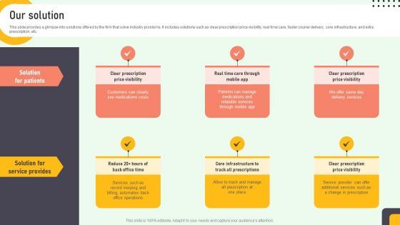 This slide provides a glimpse into solutions offered by the firm that solve industry problems. It includes solutions such as clear prescription price visibility, real time care, faster courier delivery, core infrastructure, and extra prescription, etc. The best PPT templates are a great way to save time, energy, and resources. Slidegeeks have 100 percent editable powerpoint slides making them incredibly versatile. With these quality presentation templates, you can create a captivating and memorable presentation by combining visually appealing slides and effectively communicating your message. Download Our Solution Online Medication Management Platform Pitch Deck from Slidegeeks and deliver a wonderful presentation. This slide provides a glimpse into solutions offered by the firm that solve industry problems. It includes solutions such as clear prescription price visibility, real time care, faster courier delivery, core infrastructure, and extra prescription, etc.