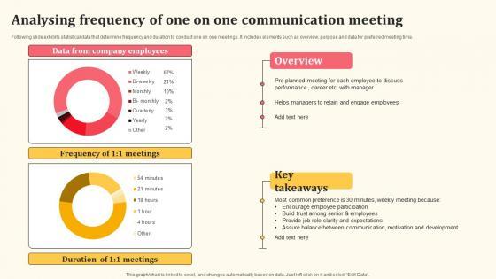 Following slide exhibits statistical data that determine frequency and duration to conduct one on one meetings. It includes elements such as overview, purpose and data for preferred meeting time. If you are looking for a format to display your unique thoughts, then the professionally designed Analysing Frequency Of One On One Communication Meeting Detailed Personnel Infographics Pdf is the one for you. You can use it as a Google Slides template or a PowerPoint template. Incorporate impressive visuals, symbols, images, and other charts. Modify or reorganize the text boxes as you desire. Experiment with shade schemes and font pairings. Alter, share or cooperate with other people on your work. Download Analysing Frequency Of One On One Communication Meeting Detailed Personnel Infographics Pdf and find out how to give a successful presentation. Present a perfect display to your team and make your presentation unforgettable. Following slide exhibits statistical data that determine frequency and duration to conduct one on one meetings. It includes elements such as overview, purpose and data for preferred meeting time.