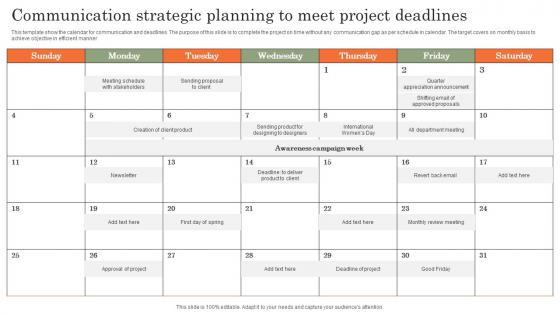 This template show the calendar for communication and deadlines. The purpose of this slide is to complete the project on time without any communication gap as per schedule in calendar. The target covers on monthly basis to achieve objective in efficient manner Showcasing this set of slides titled Communication Strategic Planning To Meet Project Deadlines Mockup Pdf. The topics addressed in these templates are Deadlines, Communication, Planning. All the content presented in this PPT design is completely editable. Download it and make adjustments in color, background, font etc. as per your unique business setting. This template show the calendar for communication and deadlines. The purpose of this slide is to complete the project on time without any communication gap as per schedule in calendar. The target covers on monthly basis to achieve objective in efficient manner