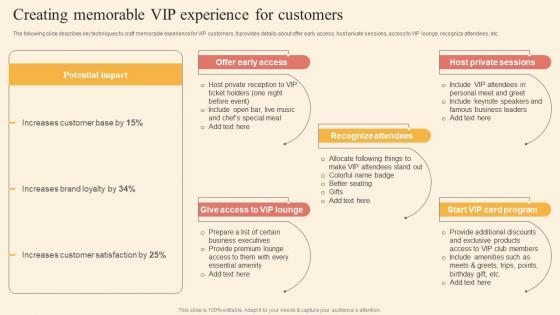 The following slide describes key techniques to craft memorable experience for VIP customers. It provides details about offer early access, host private sessions, access to VIP lounge, recognize attendees, etc.Are you in need of a template that can accommodate all of your creative concepts This one is crafted professionally and can be altered to fit any style. Use it with Google Slides or PowerPoint. Include striking photographs, symbols, depictions, and other visuals. Fill, move around, or remove text boxes as desired. Test out color palettes and font mixtures. Edit and save your work, or work with colleagues. Download Implementing Experimental Marketing Creating Memorable Vip Experience For Customers Background PDF and observe how to make your presentation outstanding. Give an impeccable presentation to your group and make your presentation unforgettable.