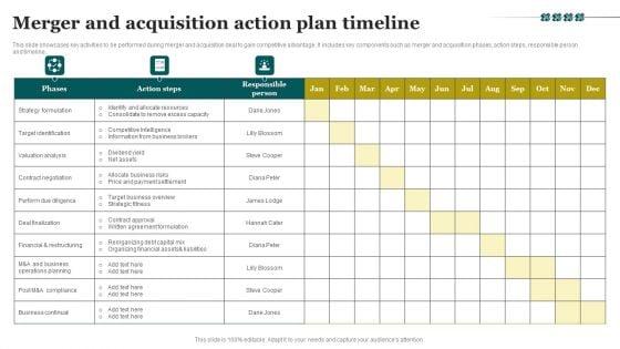 This slide showcases key activities to be performed during merger and acquisition deal to gain competitive advantage. It includes key components such as merger and acquisition phases, action steps, responsible person and timeline. Showcasing this set of slides titled Merger And Acquisition Action Plan Timeline Template PDF. The topics addressed in these templates are Strategy Formulation, Target Identification, Valuation Analysis. All the content presented in this PPT design is completely editable. Download it and make adjustments in color, background, font etc. as per your unique business setting.