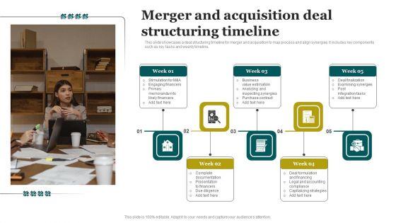 This slide showcases a deal structuring timeline for merger and acquisition to map process and align synergies. It includes key components such as key tasks and weekly timeline. Presenting Merger And Acquisition Deal Structuring Timeline Slides PDF to dispense important information. This template comprises five stages. It also presents valuable insights into the topics including Complete Documentation, Presentation Financers, Due Diligence. This is a completely customizable PowerPoint theme that can be put to use immediately. So, download it and address the topic impactfully.