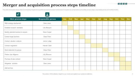 This slide showcases various steps of conducting merger and acquisition process to increase market share. It includes key components such as M and A process steps, responsible person and monthly timeline. Showcasing this set of slides titled Merger And Acquisition Process Steps Timeline Ideas PDF. The topics addressed in these templates are M A Strategy Development, Establish Research Standards, Identify Potential Business. All the content presented in this PPT design is completely editable. Download it and make adjustments in color, background, font etc. as per your unique business setting.