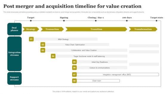 This slide showcases a timeline presenting various activities needed to be done by post merger and acquisition. It includes key components such as deal phases, integration streams and support streams. Showcasing this set of slides titled Post Merger And Acquisition Timeline For Value Creation Introduction PDF. The topics addressed in these templates are Deal Phases, Integration Streams, Support Streams. All the content presented in this PPT design is completely editable. Download it and make adjustments in color, background, font etc. as per your unique business setting.
