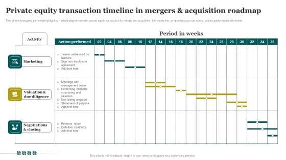 This slide showcases a timeline highlighting multiple steps involved in private equity transaction for merger and acquisition. It includes key components such as activity, actions performed and timeline. Showcasing this set of slides titled Private Equity Transaction Timeline In Mergers And Acquisition Roadmap Microsoft PDF. The topics addressed in these templates are Marketing, Valuation Due Diligence, Negotiations Closing. All the content presented in this PPT design is completely editable. Download it and make adjustments in color, background, font etc. as per your unique business setting.