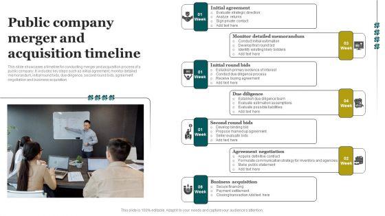 This slide showcases a timeline for conducting merger and acquisition process of a public company. It includes key steps such as initial agreement, monitor detailed memorandum, initial round bids, due diligence, second round bids, agreement negotiation and business acquisition. Presenting Public Company Merger And Acquisition Timeline Topics PDF to dispense important information. This template comprises six stages. It also presents valuable insights into the topics including Initial Agreement, Monitor Detailed Memorandum, Initial Round Bids. This is a completely customizable PowerPoint theme that can be put to use immediately. So, download it and address the topic impactfully.