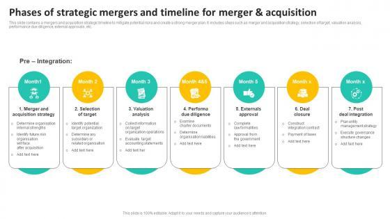 This slide contains a mergers and acquisition strategic timeline to mitigate potential risks and create a strong merger plan. It includes steps such as merger and acquisition strategy, selection of target, valuation analysis, performance due diligence, external approvals, etc. Showcasing this set of slides titled Phases Of Strategic Mergers And Timeline For Merger And Acquisition Demonstration Pdf. The topics addressed in these templates are Merger And Acquisition Strategy, Selection Of Target, Valuation Analysis. All the content presented in this PPT design is completely editable. Download it and make adjustments in color, background, font etc. as per your unique business setting. This slide contains a mergers and acquisition strategic timeline to mitigate potential risks and create a strong merger plan. It includes steps such as merger and acquisition strategy, selection of target, valuation analysis, performance due diligence, external approvals, etc.