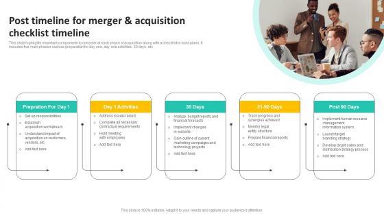 This slide highlights important components to consider at each phase of acquisition along with a checklist to build plans. It includes five main phases such as preparation for day one, day one activities, 30 days, etc. Pitch your topic with ease and precision using this Post Timeline For Merger And Acquisition Checklist Timeline Sample Pdf. This layout presents information on Establish Acquisition Workstream, Marketing Campaigns, Technology Projects. It is also available for immediate download and adjustment. So, changes can be made in the color, design, graphics or any other component to create a unique layout. This slide highlights important components to consider at each phase of acquisition along with a checklist to build plans. It includes five main phases such as preparation for day one, day one activities, 30 days, etc.