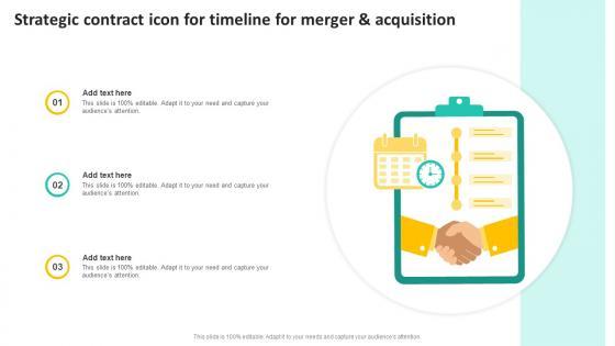 Showcasing this set of slides titled Strategic Contract Icon For Timeline For Merger And Acquisition Pictures Pdf. The topics addressed in these templates are Acquisition, Timeline For Merger, Strategic Contract Icon. All the content presented in this PPT design is completely editable. Download it and make adjustments in color, background, font etc. as per your unique business setting. Our Strategic Contract Icon For Timeline For Merger And Acquisition Pictures Pdf are topically designed to provide an attractive backdrop to any subject. Use them to look like a presentation pro.