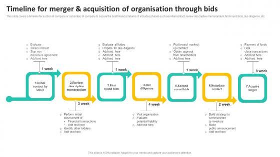 This slide covers a timeline for auction of company or subsidiary of company to secure the best financial returns. It includes phases such as initial contact, review descriptive memorandum, first round bids, due diligence, etc. Pitch your topic with ease and precision using this Timeline For Merger And Acquisition Of Organisation Through Bids Introduction Pdf. This layout presents information on Payment Of Funds, Financial Transactions, Potential Liability. It is also available for immediate download and adjustment. So, changes can be made in the color, design, graphics or any other component to create a unique layout. This slide covers a timeline for auction of company or subsidiary of company to secure the best financial returns. It includes phases such as initial contact, review descriptive memorandum, first round bids, due diligence, etc.