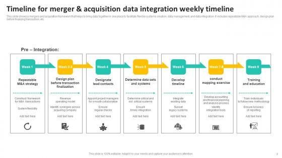 This slide shows a mergers and acquisition framework that helps to bring data together in one place to facilitate flexible systems creation, data management, and data integration. It includes repeatable MandA approach, design plan before finalizing transaction, etc. Showcasing this set of slides titled Timeline For Merger And Acquisition Data Integration Weekly Timeline Introduction Pdf. The topics addressed in these templates are Designate Lead Contacts, Develop Timeline, Conduct Mapping Exercise. All the content presented in this PPT design is completely editable. Download it and make adjustments in color, background, font etc. as per your unique business setting. This slide shows a mergers and acquisition framework that helps to bring data together in one place to facilitate flexible systems creation, data management, and data integration. It includes repeatable MandA approach, design plan before finalizing transaction, etc.