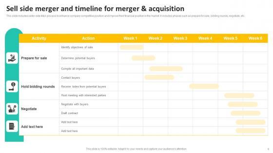 This slide includes seller side MandA process to enhance company competitive position and improve their financial position in the market. It includes phases such as prepare for sale, bidding rounds, negotiate, etc. Pitch your topic with ease and precision using this Sell Side Merger And Timeline For Merger And Acquisition Elements Pdf. This layout presents information on Prepare For Sale, Determine Potential Buyers, Sell Side Merger Timeline. It is also available for immediate download and adjustment. So, changes can be made in the color, design, graphics or any other component to create a unique layout. This slide includes seller side MandA process to enhance company competitive position and improve their financial position in the market. It includes phases such as prepare for sale, bidding rounds, negotiate, etc.