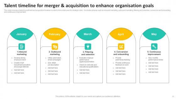 This slide includes a talent recruitment and acquisition timeline in order to hire employees for strategic roles. It includes phases such as inbound marketing, outbound marketing, filtering and selection, conversion and onboarding, and continuous improvement. Pitch your topic with ease and precision using this Talent Timeline For Merger And Acquisition To Enhance Organisation Goals Introduction Pdf. This layout presents information on Inbound Marketing, Outbound Marketing, Filtering And Selection. It is also available for immediate download and adjustment. So, changes can be made in the color, design, graphics or any other component to create a unique layout. This slide includes a talent recruitment and acquisition timeline in order to hire employees for strategic roles. It includes phases such as inbound marketing, outbound marketing, filtering and selection, conversion and onboarding, and continuous improvement.
