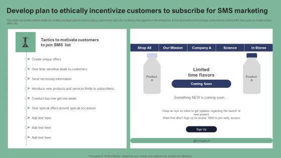 This slide represents details related to creating strategic plan for encouraging customers to opt in for receiving messages from the enterprise. It includes tactics to encourage customers for joining SMS lists such as create unique offers etc. Slidegeeks is here to make your presentations a breeze with Develop Plan To Ethically Incentivize Customers Text Message Marketing Strategies Download Pdf With our easy-to-use and customizable templates, you can focus on delivering your ideas rather than worrying about formatting. With a variety of designs to choose from, you are sure to find one that suits your needs. And with animations and unique photos, illustrations, and fonts, you can make your presentation pop. So whether you are giving a sales pitch or presenting to the board, make sure to check out Slidegeeks first. This slide represents details related to creating strategic plan for encouraging customers to opt in for receiving messages from the enterprise. It includes tactics to encourage customers for joining SMS lists such as create unique offers etc.