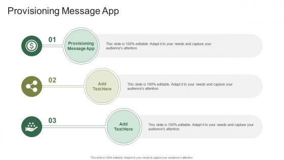 Presenting our innovatively designed set of slides titled Provisioning Message App In Powerpoint And Google Slides Cpb. This completely editable PowerPoint graphic exhibits Provisioning Message App that will help you convey the message impactfully. It can be accessed with Google Slides and is available in both standard screen and widescreen aspect ratios. Apart from this, you can download this well structured PowerPoint template design in different formats like PDF, JPG, and PNG. So, click the download button now to gain full access to this PPT design. Our Provisioning Message App In Powerpoint And Google Slides Cpb are topically designed to provide an attractive backdrop to any subject. Use them to look like a presentation pro.