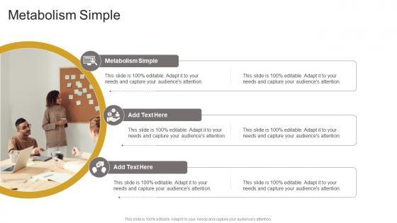 Introducing our well designed Metabolism Simple In Powerpoint And Google Slides Cpb This PowerPoint design presents information on topics like Metabolism Simple As it is predesigned it helps boost your confidence level. It also makes you a better presenter because of its high quality content and graphics. This PPT layout can be downloaded and used in different formats like PDF, PNG, and JPG. Not only this, it is available in both Standard Screen and Widescreen aspect ratios for your convenience. Therefore, click on the download button now to persuade and impress your audience. Our Metabolism Simple In Powerpoint And Google Slides Cpb are topically designed to provide an attractive backdrop to any subject. Use them to look like a presentation pro.